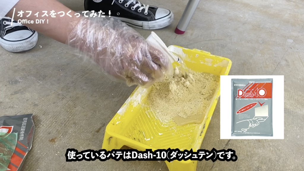 壁紙を全て剥がし終わったら、大きな穴を「Dash-10」というパテで埋めていきました。